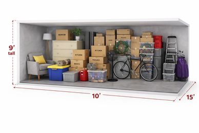 A 10x15 storage unit can hold the contents of a 2–3 bedroom apartment or a small house, including large furniture, appliances, mattresses, boxes, and seasonal items. 9' Tall Unit