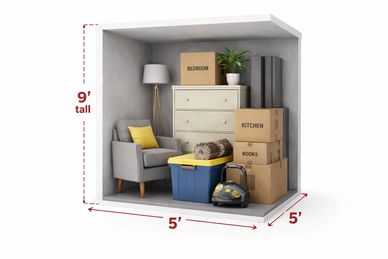 A 5x5 storage unit fits items like a twin mattress, small dresser, several boxes, luggage, or sports equipment—perfect for storing the contents of a dorm room, closet, or small office. 9' Tall Unit